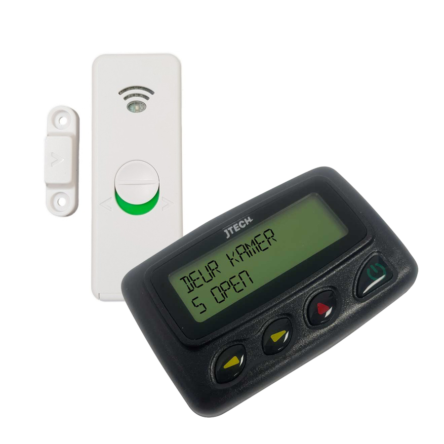 Een deurcontact en een Alpha pager. Als de deur opengaat wordt er een tekstbericht naar de pager gezonden. U kunt opgeven welke tekst dit moet worden. Ideaal te gebruiken in de thuiszorg of in verzorgingshuizen als dwaaldetectie systeem.