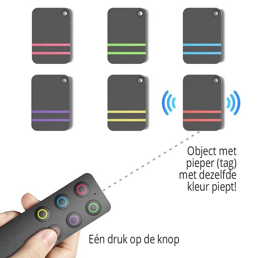 Wanneer een object ”kwijt” is, drukt u op de gekleurde knop van de afstandbediening en deze zal de pieper bij het object af laten gaan. U kunt zo het geluid volgen en het object terug vinden.