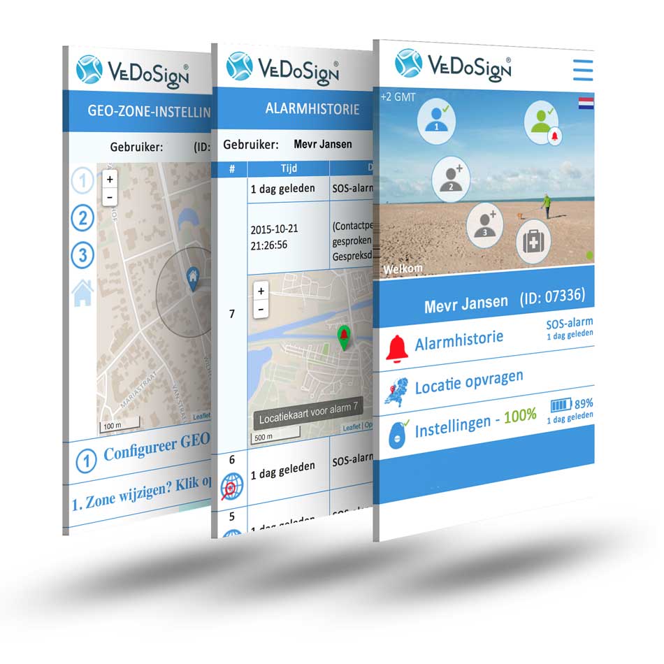In geval van nood of wanneer men zich onveilig voelt kan de gebruiker met één druk op de knop (minimaal 3 seconden ingedrukt houden totdat u een pieptoon hoort en het alarmdevice voelt trillen) automatisch meerdere contactpersonen tegelijkertijd alarmeren. Zodra één van de contactpersonen het alarm accepteert ontstaat er direct een spraakverbinding met de gebruiker. De andere contactpersonen worden geïnformeerd dat het alarm in behandeling is. Het VeDoSign protect platform stuurt ook automatisch de locatie van de gebruiker door. Locatiebepaling en het kunnen instellen van zogenaamde veilige zones is een belangrijk onderdeel van het platform. Deze functies zijn uitermate geschikt voor bijvoorbeeld mensen met die veel met agressie te doen hebben, gevoelige functies, ouderen, dementie en mensen die vaak alleen werken.