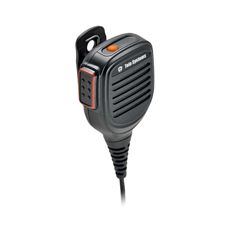 Luidspreker schoudermicrofoon voor de TeloPTT 4G portofoons met noodknop aan de bovenkant. Met deze schoudermicrofoon kunt u snel en handenvrij communiceren.